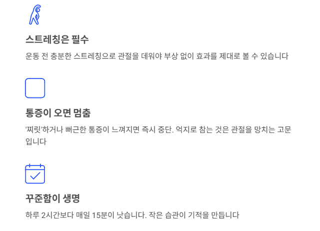 - 스트레칭은 필수: 운동 전 충분한 스트레칭으로 관절을 데워야 부상 없이 무릎관절에 좋은 운동 효과를 제대로 볼 수 있습니다.
