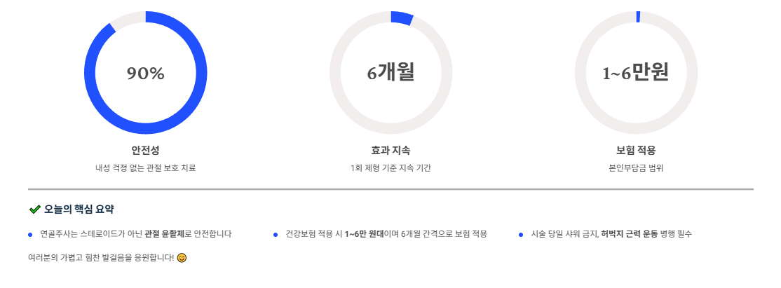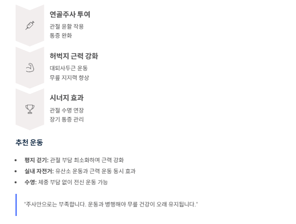 - 시술 당일은 샤워 금지이며, 주사 후에는 허벅지 근력 운동을 병행해야 효과가 오래갑니다.