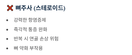 - 뼈주사 (스테로이드): 강력한 항염증제로 통증을 즉각적으로 없애주지만, 반복해서 맞으면 연골이 녹거나 뼈가 약해지는 부작용이 있습니다.