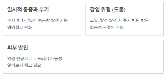 - 피부 발진: 약물 반응으로 주사 부위에 두드러기가 날 수 있습니다.