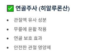 - 단순 윤활 작용을 넘어 조직 재생을 돕고 점도가 높아 통증 완화에 효과적이라고 알려져 있습니다.