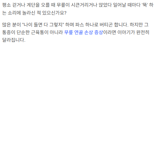 | 무릎 앞쪽에서 소리가 나고 시큰거림 | 연골 연화증 | 젊은 층에게 흔한 무릎 연골 손상 증상 |