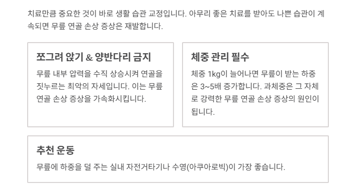아무리 좋은 치료를 받아도 나쁜 습관이 계속되면 무릎 연골 손상 증상은 재발합니다.