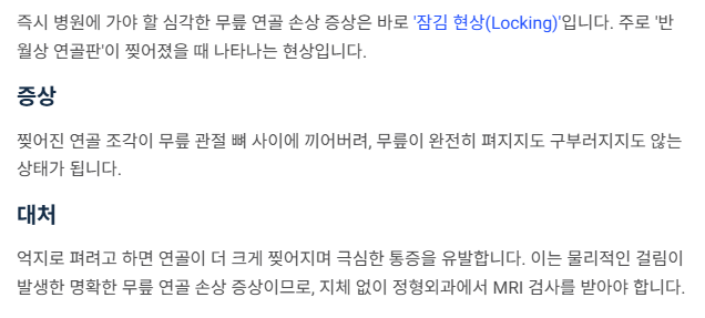 - 증상: 찢어진 연골 조각이 무릎 관절 뼈 사이에 끼어버려, 무릎이 완전히 펴지지도 구부러지지도 않는 상태가 됩니다.