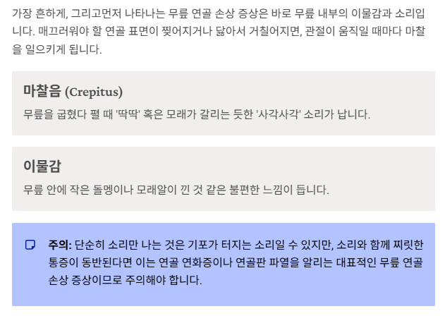 - 마찰음 (Crepitus): 무릎을 굽혔다 펼 때 '딱딱' 혹은 모래가 갈리는 듯한 '사각사각' 소리가 납니다.