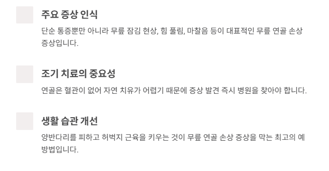 - 양반다리를 피하고 허벅지 근육을 키우는 것이 무릎 연골 손상 증상을 막는 최고의 예방법이다.
