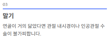- 말기: 연골이 거의 닳았다면 관절 내시경이나 인공관절 수술이 불가피합니다.