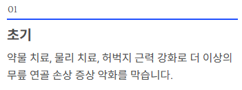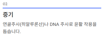 - 중기: 연골주사(히알루론산)나 DNA 주사로 윤활 작용을 돕습니다.