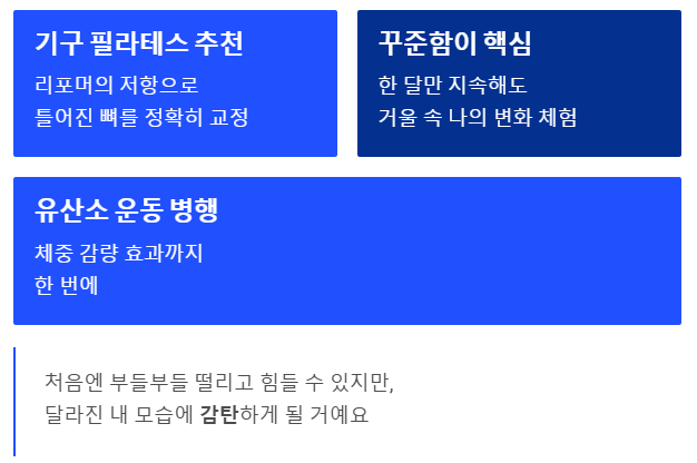 거북목, 라운드 숄더, 골반 비틀림 등 무너진 체형을 바로잡는 데 탁월하기 때문이죠.