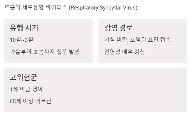 주로 가을부터 초봄(10월~3월) 사이에 유행하며, 호흡기 점막을 통해 감염을 일으킵니다.