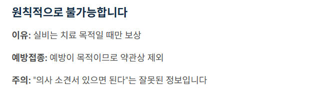 - 이유: 실비 보험은 '아픈 곳을 치료'할 때 나옵니다. 예방접종은 치료가 아닌 '예방'이 목적이기 때문에 약관상 보상하지 않는 손해에 해당합니다.