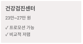 | 건강검진센터 | 23만 원 ~ 27만 원 | 프로모션 시 조금 더 저렴함 |