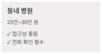 | 동네 내과/이비인후과 | 25만 원 ~ 30만 원 | 접근성이 좋음, 전화 문의 필수 |