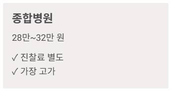 | 종합병원 | 28만 원 ~ 32만 원 | 진찰료가 별도로 붙을 수 있음 |