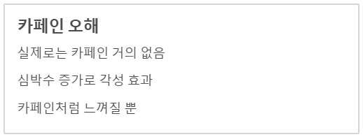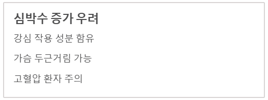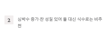 - 심박수를 높일 수 있고 찬 성질이 있어 물 대신 식수로 마시는 것은 비추천합니다.