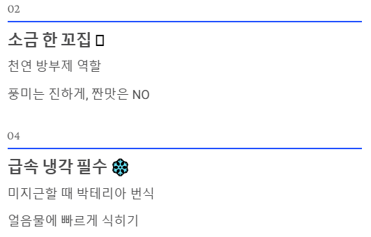 짠맛은 전혀 나지 않고 풍미가 진해질 뿐만 아니라, 소금이 천연 방부제 역할을 하여 쉬는 속도를 늦춰줍니다.