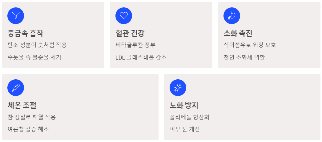 1. 중금속 및 노폐물 흡착 (천연 필터) 💧