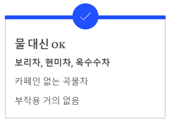 | 물 대신 가능 (O) | 보리차, 현미차, 옥수수차 | 카페인 無, 곡물차라 부작용 적음 |