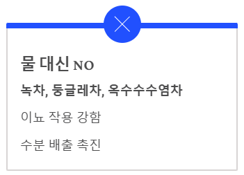 | 물 대신 불가능 (X) | 녹차, 둥글레차, 옥수수수염차 | 이뇨 작용으로 오히려 수분 배출 |