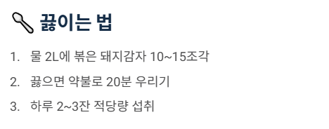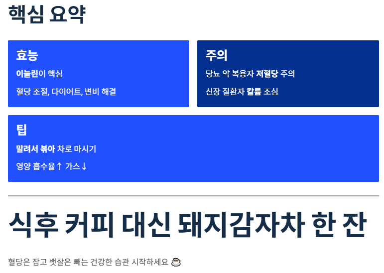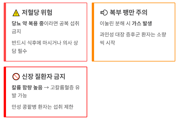 - 주의사항: 당뇨 약 복용자는 저혈당을 주의하고, 신장 질환자는 칼륨 수치를 조심해야 합니다.