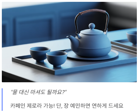 - Q. 물 대용 가능? 카페인이 없어 물처럼 마셔도 되지만, 앞서 말씀드린 대로 가스가 차거나 장이 예민한 분은 연하게 드시거나 하루 2~3잔으로 양을 조절하는 것이 좋습니다.