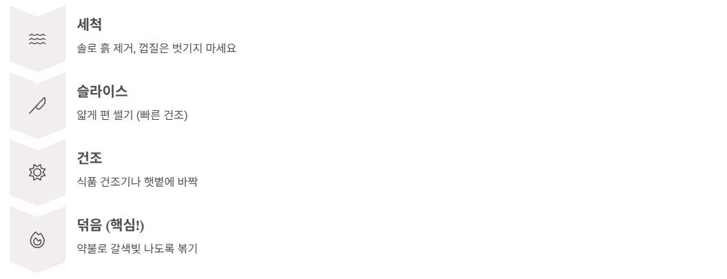 | 말린(볶은) 차 | 이눌린 흡수율 UP, 구수함 | 만드는 과정 번거로움 | 밀폐 용기에 담아 서늘한 곳 |