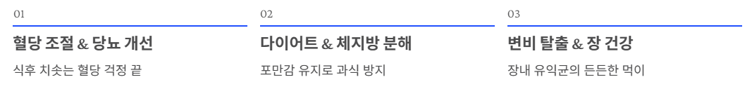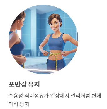 위장에서 수분을 흡수해 젤리처럼 변하는데, 이 과정에서 포만감을 오래 유지해 주어 과식을 막습니다.