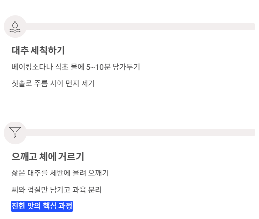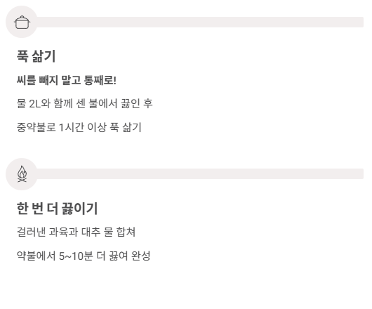 - 대추차 만드는법: 씨를 빼지 않고 통째로 푹 삶은 뒤, 체에 으깨어 걸쭉하게(대추고) 만드는 것이 맛과 영양의 비결입니다.