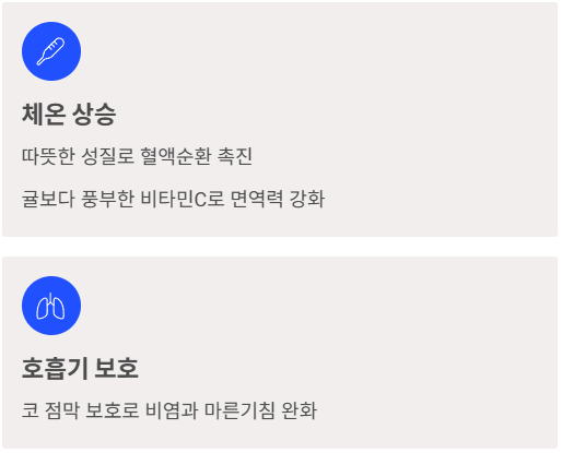 코 점막을 촉촉하고 튼튼하게 하여 비염이나 마른기침 완화에 도움을 줍니다. (생강과 함께 끓이면 시너지가 납니다.)