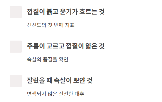 | 속 | 잘랐을 때 속살이 뽀얀 것 | 냉동 보관 (가장 안전) |