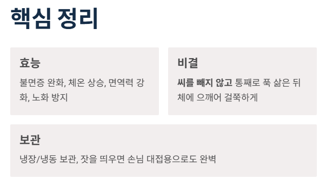 - 중요: 신경을 안정시키는 성분은 과육보다 '대추씨(산조인)'에 훨씬 많습니다. 따라서 차를 끓일 때 씨를 절대 버리지 말고 통째로 끓여야 불면증 완화 효과를 볼 수 있습니다.