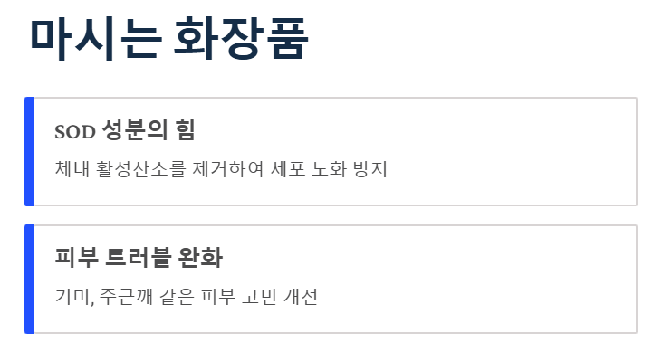 - 이 성분은 체내 활성산소를 제거하여 세포 노화를 막고, 기미나 주근깨 같은 피부 트러블을 완화해 '마시는 화장품'이라고도 불립니다.