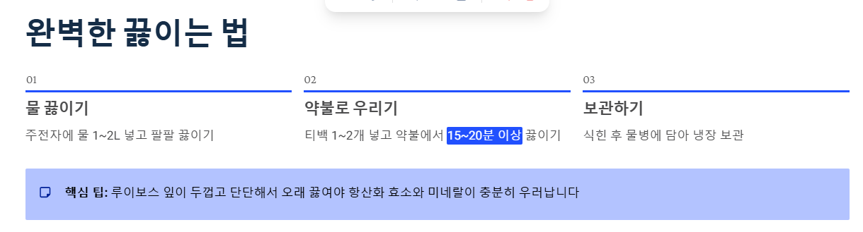 - Tip: 루이보스의 잎은 두껍고 단단해서 오래 끓여야 항산화 효소와 미네랄이 충분히 우러나옵니다.