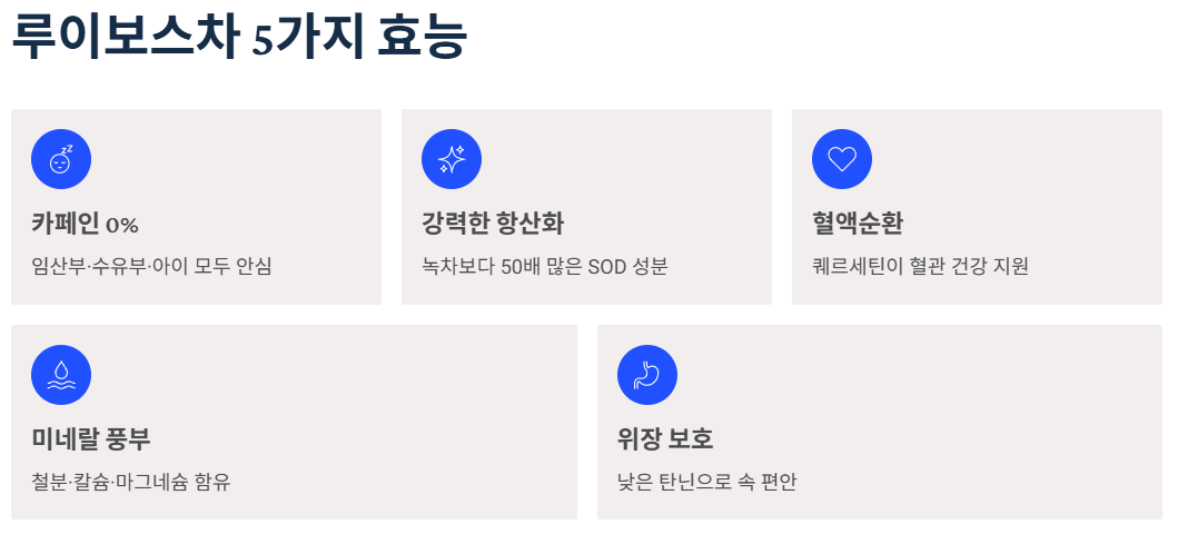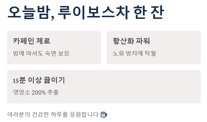 - 루이보스차의 효능: 카페인 제로로 임산부와 아이도 안심하고 마실 수 있으며, 항산화 성분이 풍부해 노화 방지에 탁월합니다.