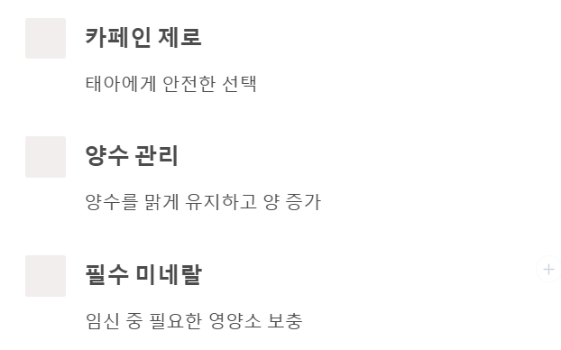 | 추천 대상 | 임산부, 아이, 불면증 | 다이어터, 집중력 | 갈증 해소, 식수 |