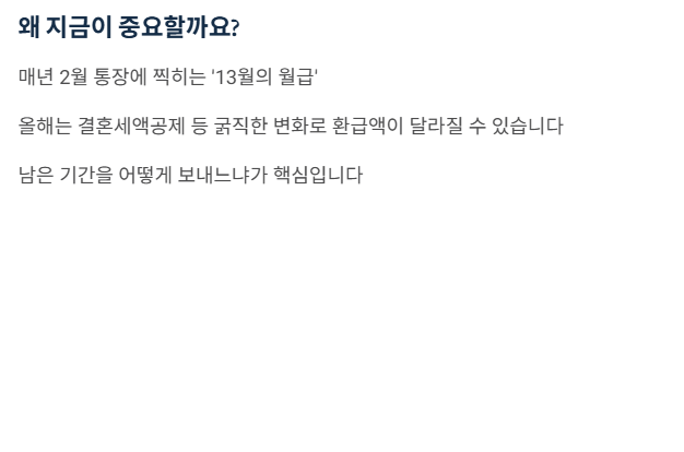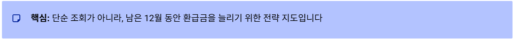 - 환급금 예측: 내가 받을 돈(또는 낼 돈)을 미리 파악하여 연말 자금 계획을 세울 수 있습니다.