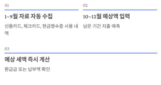 - Step 01. 신용카드 소득공제액 계산: 자동으로 불러와진 1~9월 사용액을 확인하고, 10~12월 예상 사용액을 입력합니다.