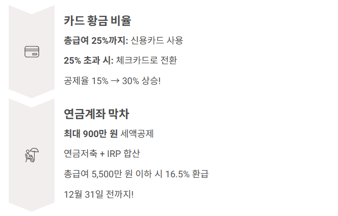 | 신용카드 공제 | 전년 대비 5% 초과 사용분 10% 추가 공제 | 소비 증가분에 대한 혜택 |