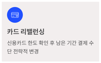 - 카드 리밸런싱: 신용카드 소득공제 한도를 채웠는지 연말정산 미리보기로 확인 후, 남은 기간 결제 수단(체크카드 등)을 변경할 수 있습니다.