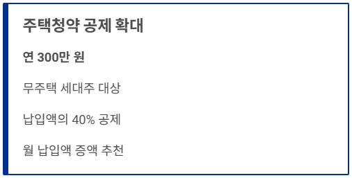| 주택청약 공제 | 납입 한도 연 300만 원으로 상향 | 기존 240만 원에서 확대 ⬆️ |