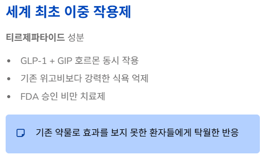 - 핵심: 두 가지 경로로 식욕을 억제하기 때문에, 기존 약물(삭센다, 위고비)로 효과를 보지 못한 '내성 환자'들에게 폭발적인 반응을 얻고 있습니다.