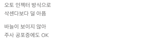 바늘이 보이지 않게 숨겨져 있어 주사 공포증이 있는 분들도 쉽게 사용 가능합니다.