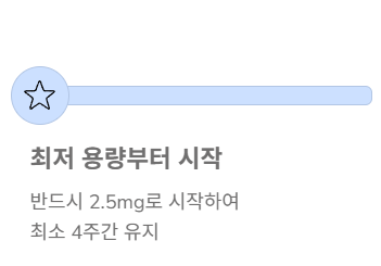 - 안전 수칙: 반드시 최저 용량(2.5mg)을 최소 4주간 유지해야 하며, 부작용이 있다면 증량하지 않고 유지하거나 투여 간격을 늘려야 합니다.