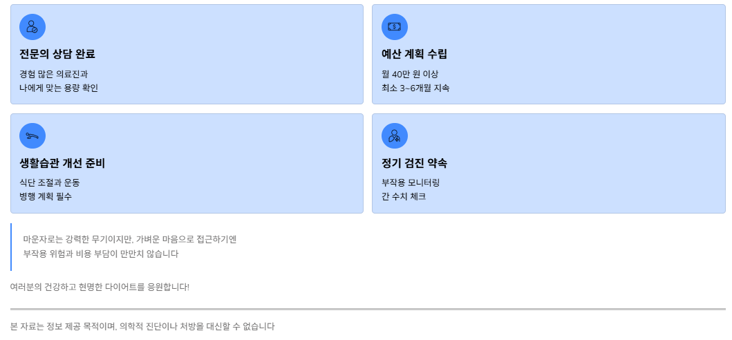 - 주의사항: 5mg 이상으로 용량을 올리면 위고비와 가격 차이가 좁혀지므로, 장기 플랜을 짤 때 예산을 넉넉히 잡아야 합니다.