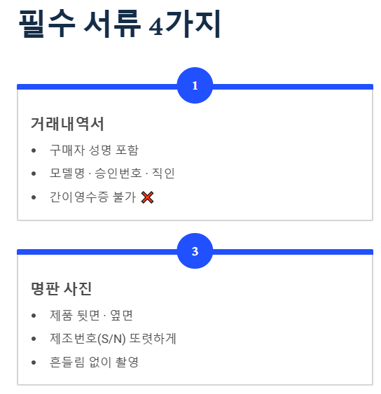 - 거래내역서: 구매자 성명, 모델명, 승인번호, 직인 등이 포함된 상세 내역서 (간이영수증 X)