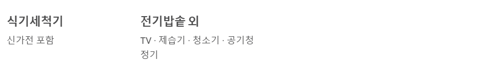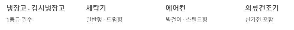 | 필수 가전 | 냉장고, 김치냉장고, 세탁기(일반/드럼), TV | 냉장고, 김치냉장고는 1등급 필수 |