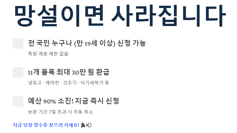 ⚠️ 주의: "연말까지 하겠지"라고 생각하다가 예산이 바닥나면, 1등급 제품을 샀어도 환급금은 0원입니다.