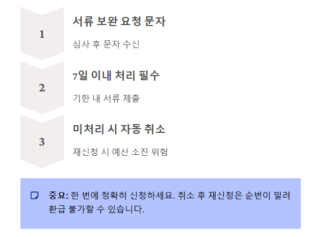 - 예산 90% 소진! 보완 기간 7일 넘기면 자동 취소되니 한 번에 정확히 신청 필수.