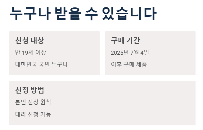 - 조건: 2025년 7월 4일 이후 구매하고 신청한 경우 (본인 신청 원칙/대리 가능)