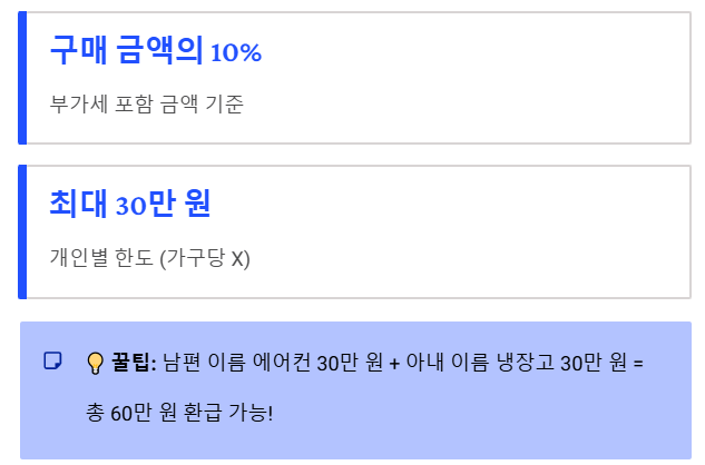 - 꿀팁: 가구당 한도가 아니라 개인별 한도입니다. 남편 이름으로 에어컨(30만 원 환급), 아내 이름으로 냉장고(30만 원 환급)를 샀다면 각각 받을 수 있습니다!